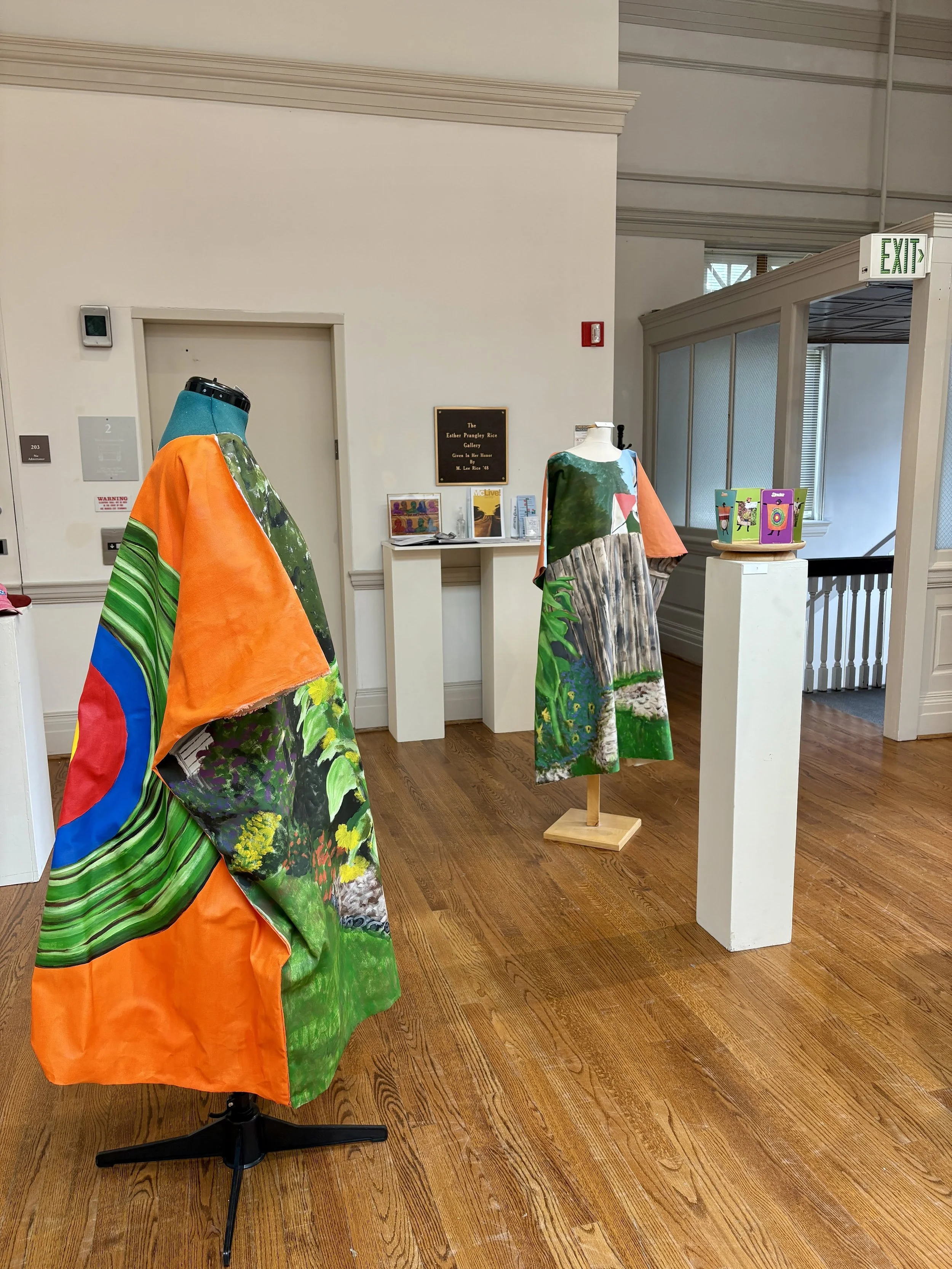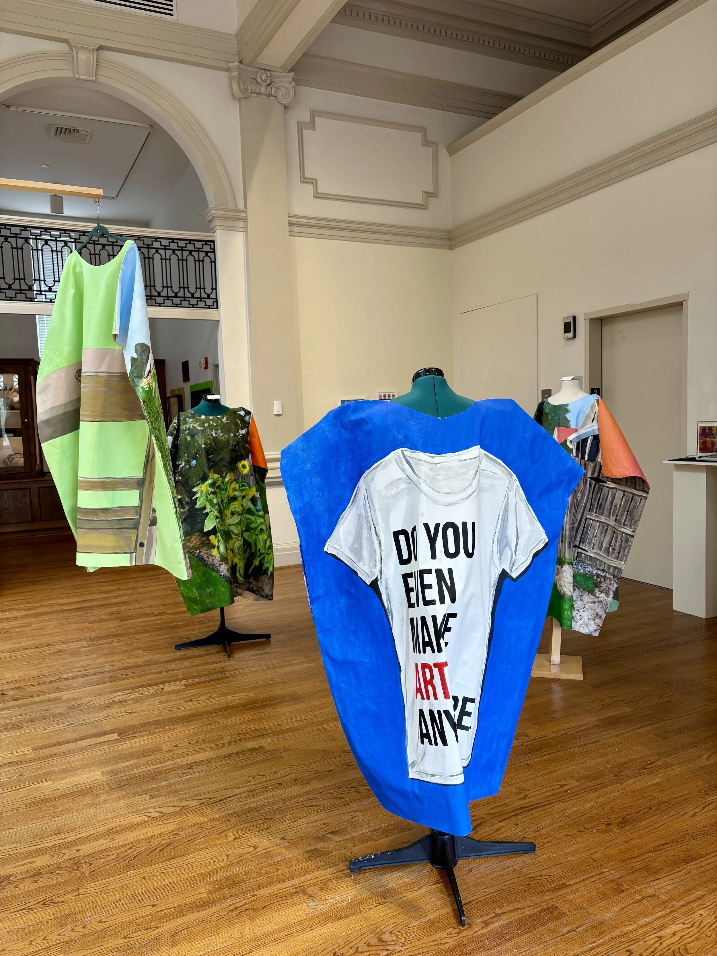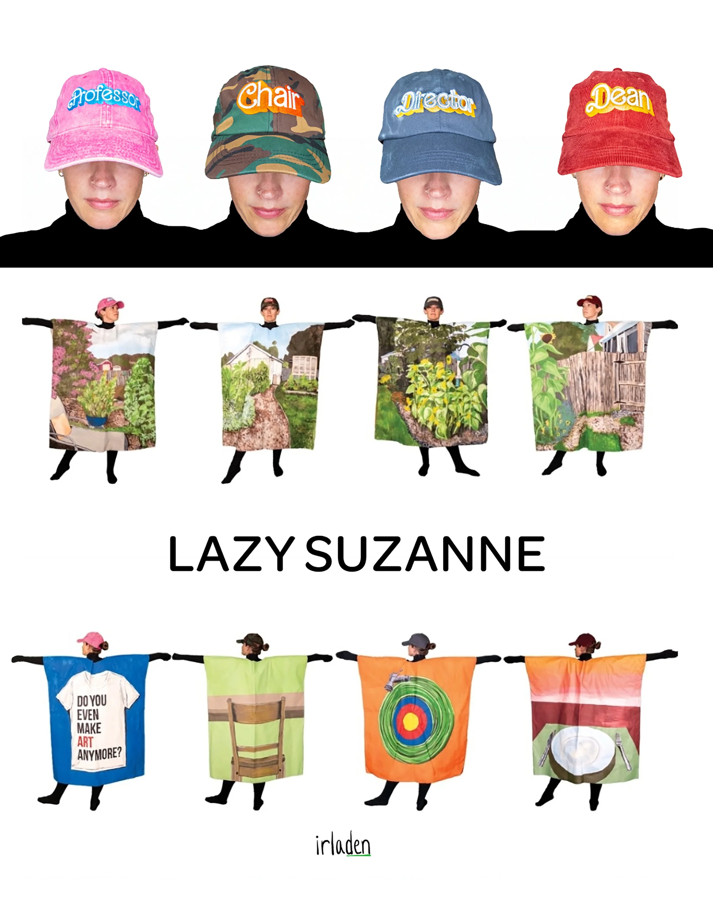 Lazy Suzanne is a new, in-progress series of multimedia work based on my experiences as a an art professor, department chair, program director, and assistant dean. The front-sides of the wearable paintings depict a panorama of my garden–my sanctuary for calm amidst my many responsibilities. The back-sides of the paintings depict visual symbols and metaphors related to my experience serving in each professional role: having a seat at the table, having a lot on my place, having a fire hose of tasks pointed at me, and a nod to Taylor Swift’s Red-era t-shirts with a question commonly asked of me: Do you even make art anymore? I sure do!