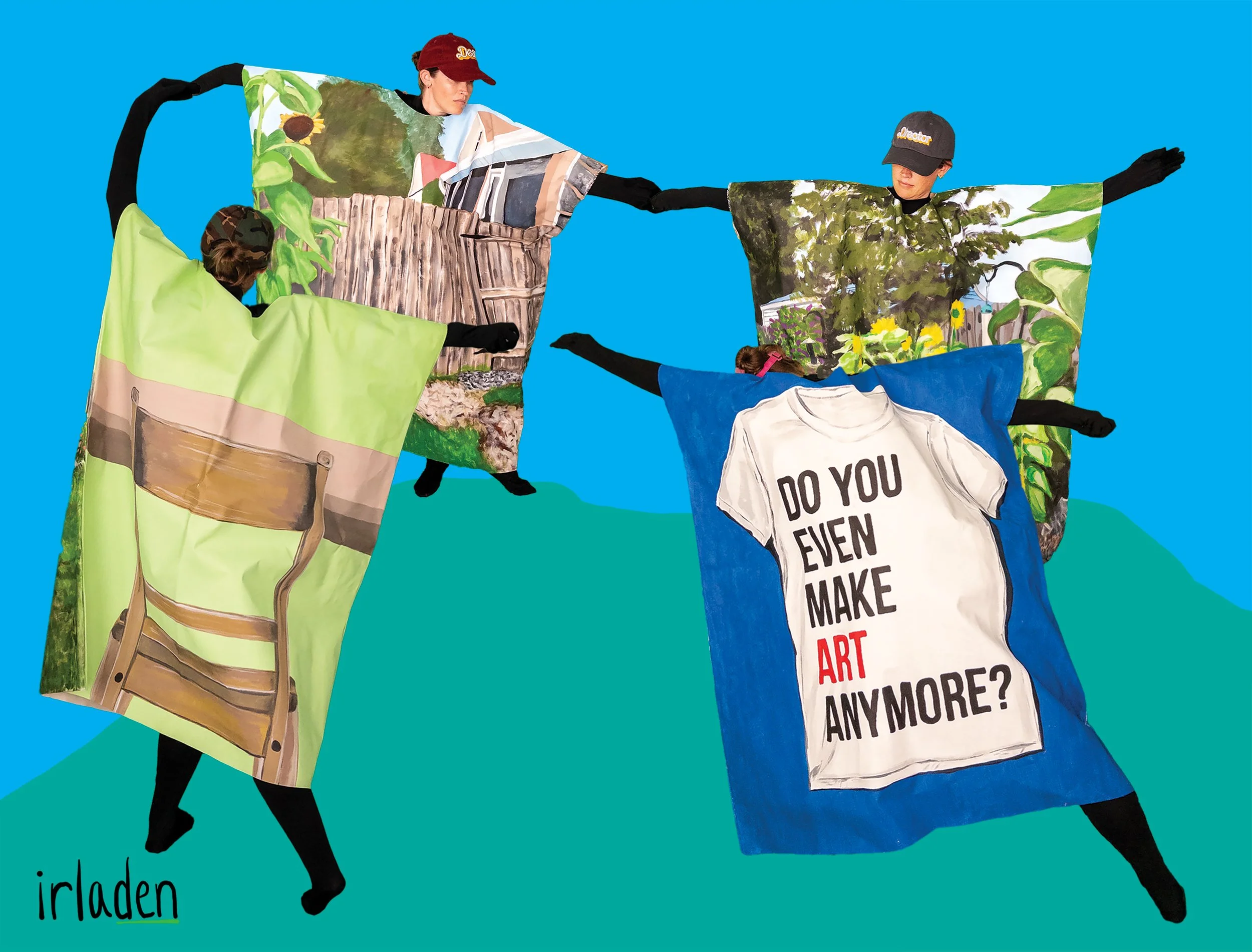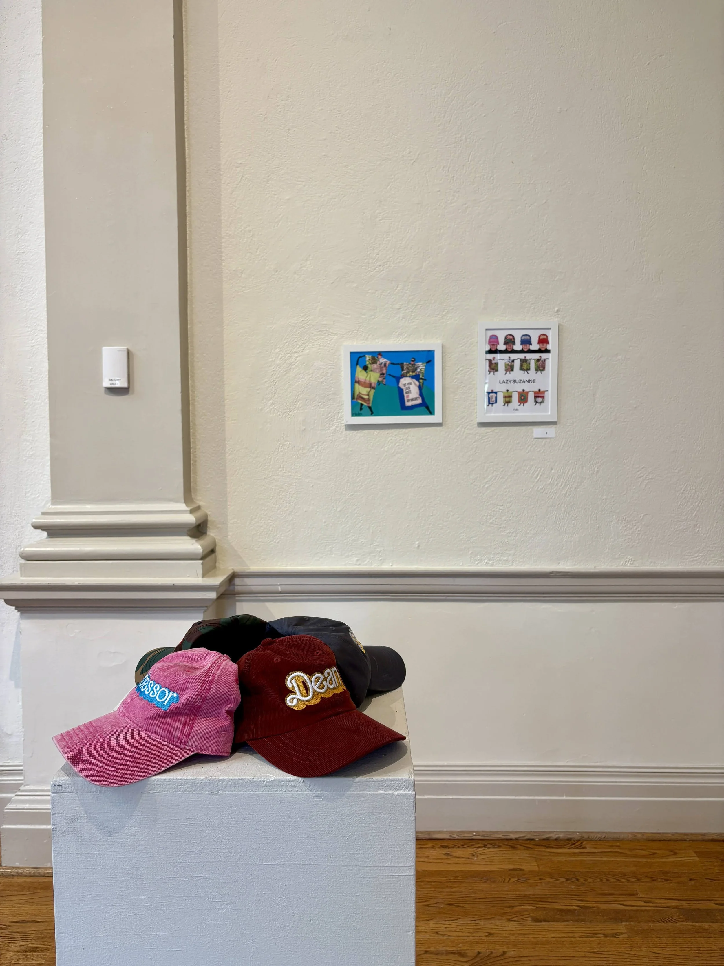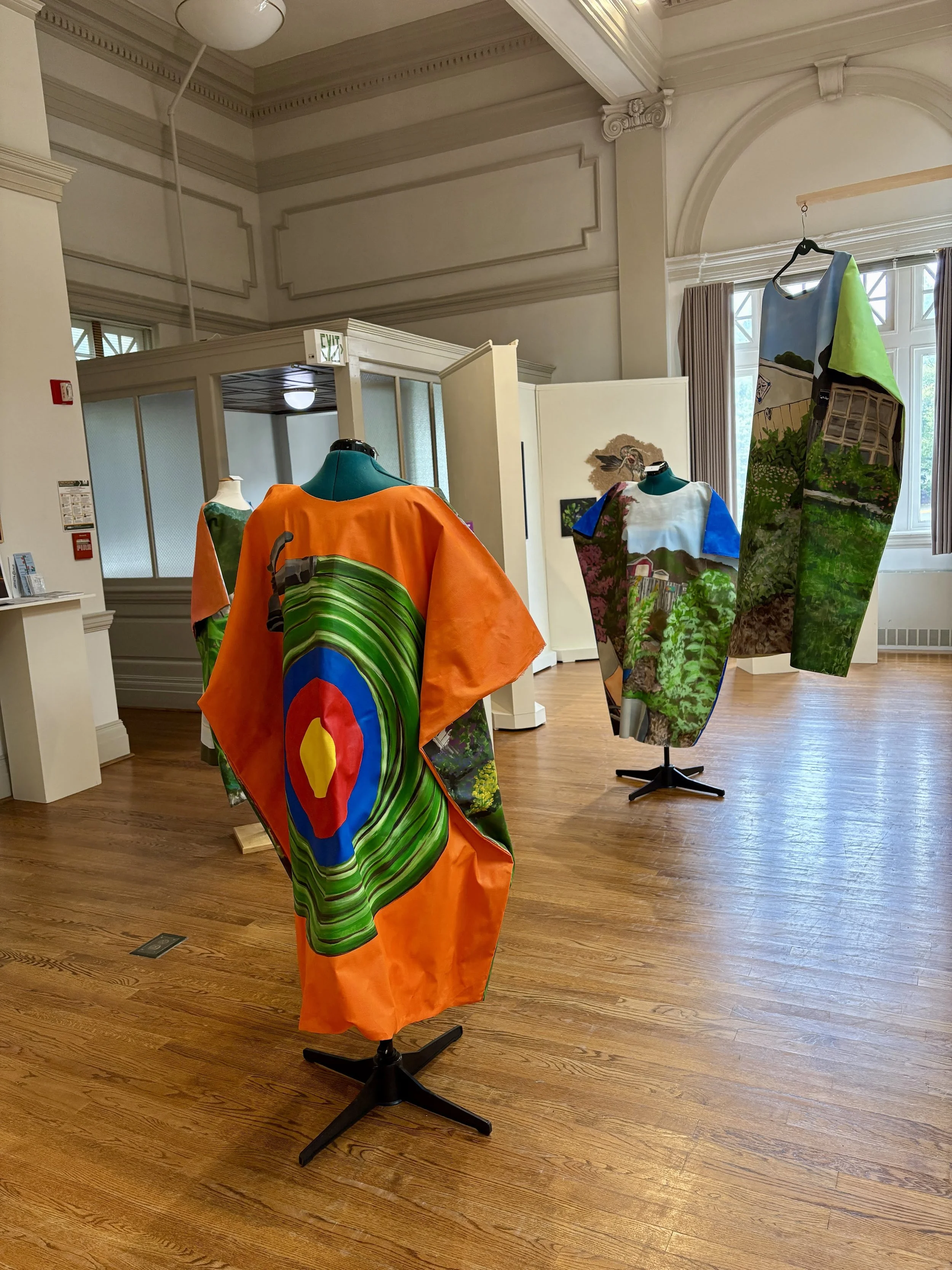 Lazy Suzanne is a new, in-progress series of multimedia work based on my experiences as a an art professor, department chair, program director, and assistant dean. The front-sides of the wearable paintings depict a panorama of my garden–my sanctuary for calm amidst my many responsibilities. The back-sides of the paintings depict visual symbols and metaphors related to my experience serving in each professional role: having a seat at the table, having a lot on my place, having a fire hose of tasks pointed at me, and a nod to Taylor Swift’s Red-era t-shirts with a question commonly asked of me: Do you even make art anymore? I sure do!
